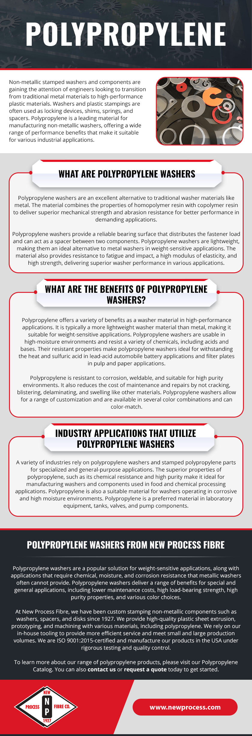 At New Process Fibre, we have been custom stamping non-metallic components such as washers, spacers, and disks since 1927. We provide high-quality plastic sheet extrusion, prototyping, and machining with various materials, including polypropylene. We rely on our in-house tooling to provide more efficient service and meet small and large production volumes. We are ISO 9001:2015-certified and manufacture our products in the USA under rigorous testing and quality control.