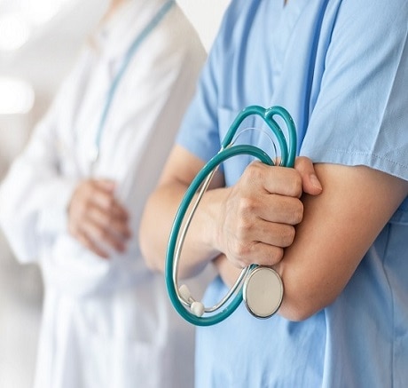 Surgeon and anesthetist doctor ER team with medical clinic room background for emergency nursing care professional teamwork and patient trust in hospital’s hospitality concept