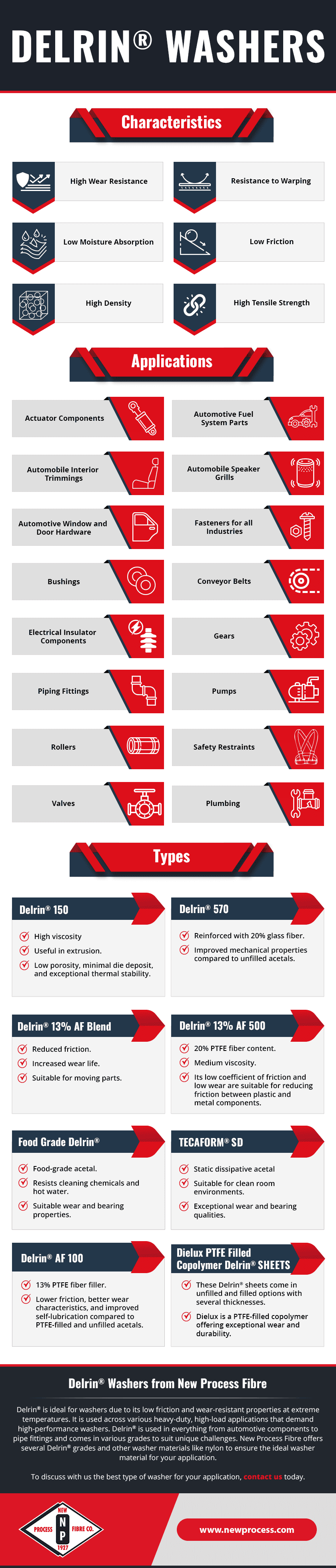 Delrin®️ is ideal for washers due to its low friction and wear-resistant properties at extreme temperatures. It is used across various heavy-duty, high-load applications that demand high-performance washers. Delrin®️ is used in everything from automotive components to pipe fittings and comes in various grades to suit unique challenges. New Process Fibre offers several Delrin®️ grades and other washer materials like nylon to ensure the ideal washer material for your application.