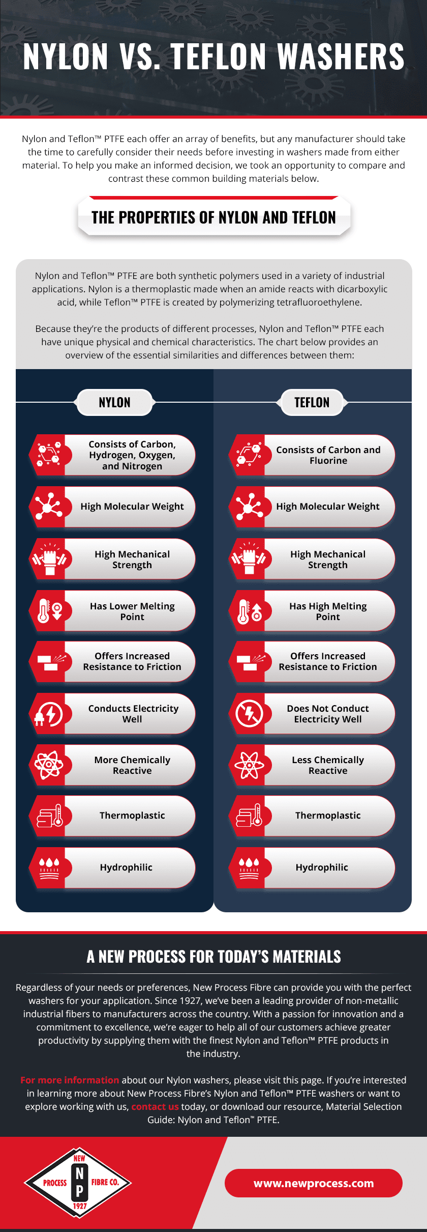 For more information about our nylon washers, please visit this page. If you’re interested in learning more about New Process Fibre’s nylon and Teflon washers or want to explore working with us, contact us today, or download our resource, Material Selection Guide: Nylon and Teflon™ PTFE.